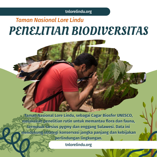 Taman Nasional Lore Lindu, sebagai Cagar Biosfer UNESCO, melakukan penelitian rutin untuk memantau flora dan fauna, termasuk tarsius pygmy dan enggang Sulawesi. Data ini mendukung strategi konservasi jangka panjang dan kebijakan perlindungan lingkungan. Penelitian ini juga menarik ilmuwan global untuk mempelajari keanekaragaman hayati unik Wallacea.