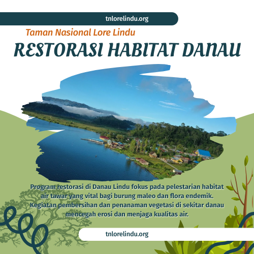 Program restorasi di Danau Lindu fokus pada pelestarian habitat air tawar yang vital bagi burung maleo dan flora endemik. Kegiatan pembersihan dan penanaman vegetasi di sekitar danau mencegah erosi dan menjaga kualitas air. Inisiatif ini mendukung ekowisata dan keberlanjutan ekosistem sebagai sumber air bagi masyarakat Sulawesi Tengah.